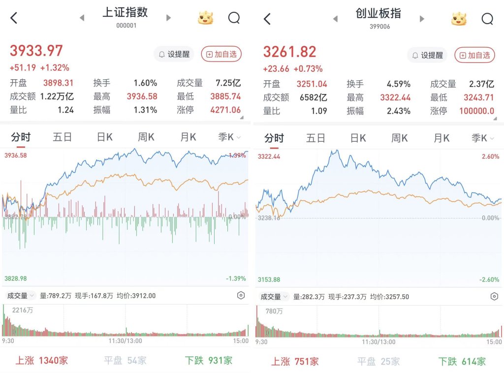 至收盘,上证综指涨1.32%,报3933.97点;科创50指数涨2.93%,报1539.08点;深证成指涨1.47%,报13725.56点;创业板指涨0.73%,报3261.82点。